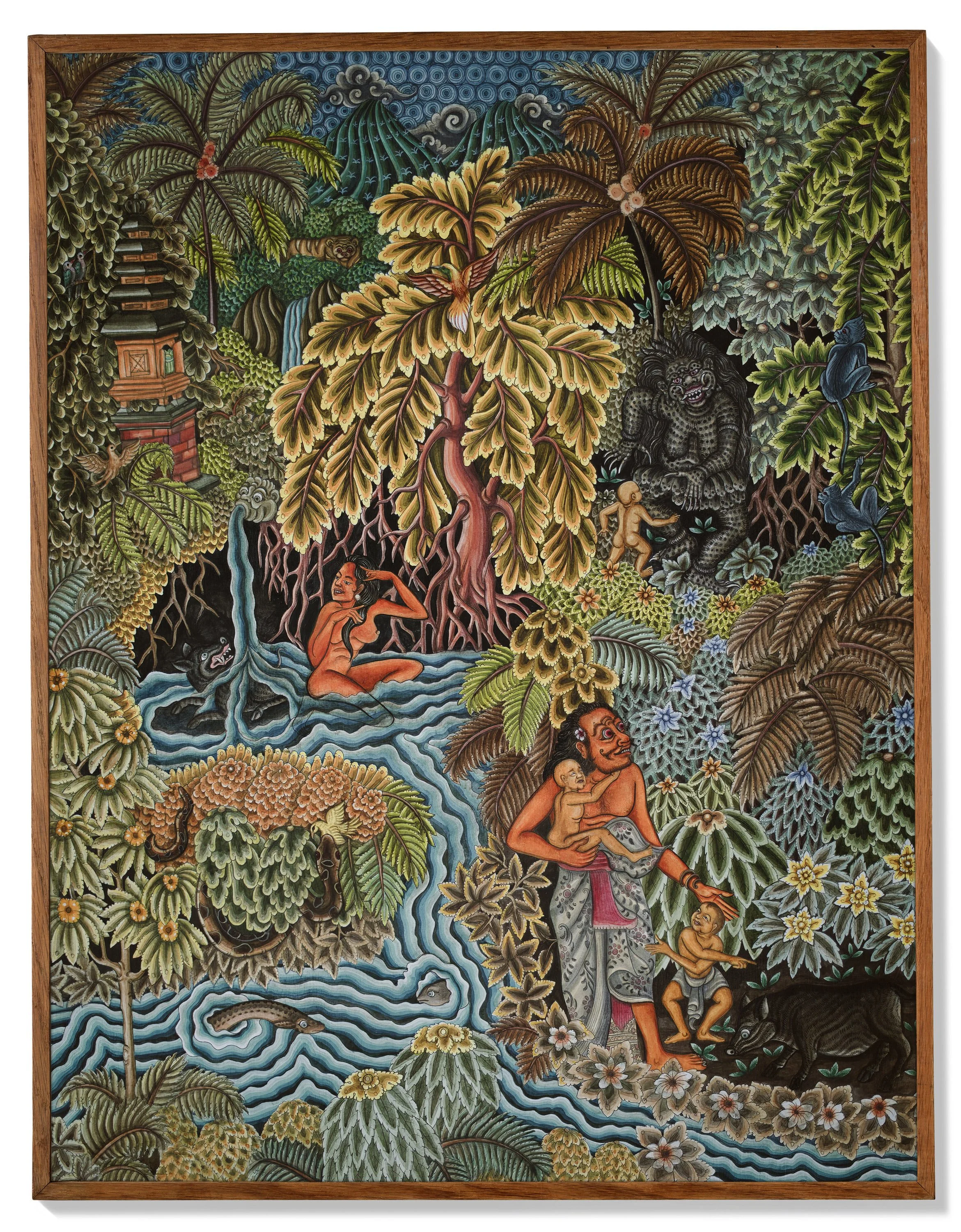 The painting vividly captures the duality of the human and spirit realms. A family frantically searches for a missing child, surrounded by dense, vibrant foliage where the Memedi are concealed. In Balinese tradition, the key to retrieving a lost child lies in the unity of the community and the power of the Gamelan—traditional Balinese music played continuously until the child is safely returned to the human realm.